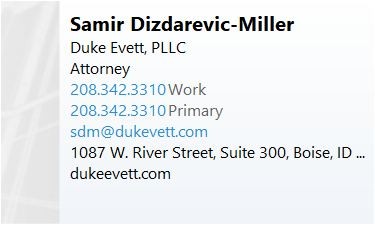 Born in Bosnia and raised in Meridian, Idaho, Samir Dizdarevic-Miller graduated from the University of Idaho College of Law as a first-generational higher education student in 2020. Immediately after law school, Samir clerked for the Honorable Judge George B. Fearing of the Washington State Court of Appeals, Division III in Spokane, Washington. Following his clerkship, Samir began his career as a private litigator, spending three years at a Spokane-based, mid-sized law firm, where he focused on commercial disputes, personal injury, employment law, municipal law, medical malpractice, appeals, and criminal defense.